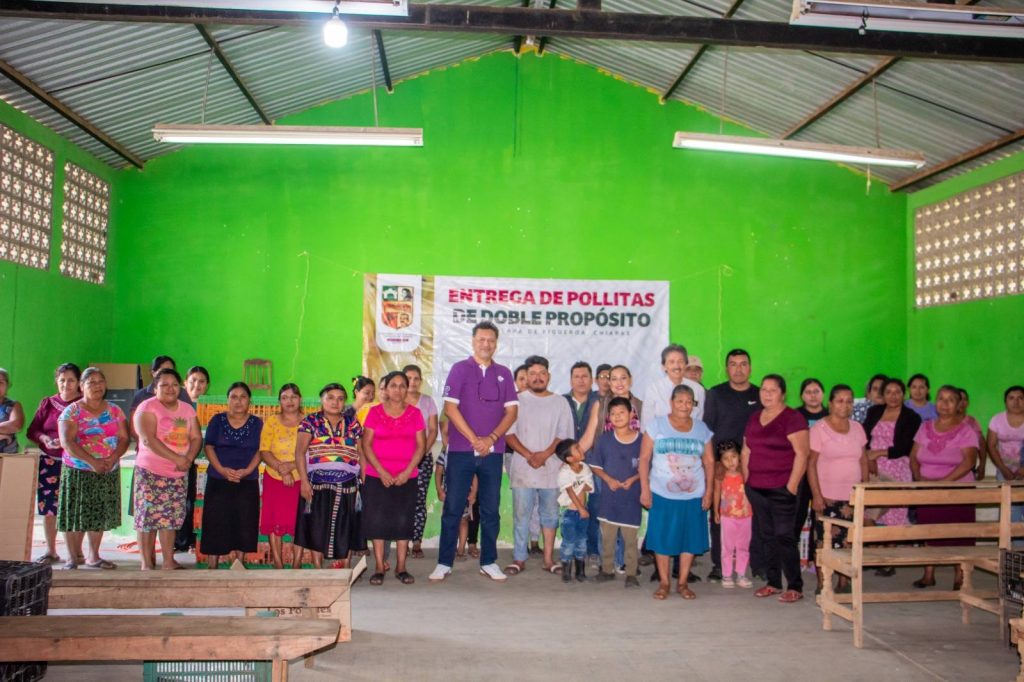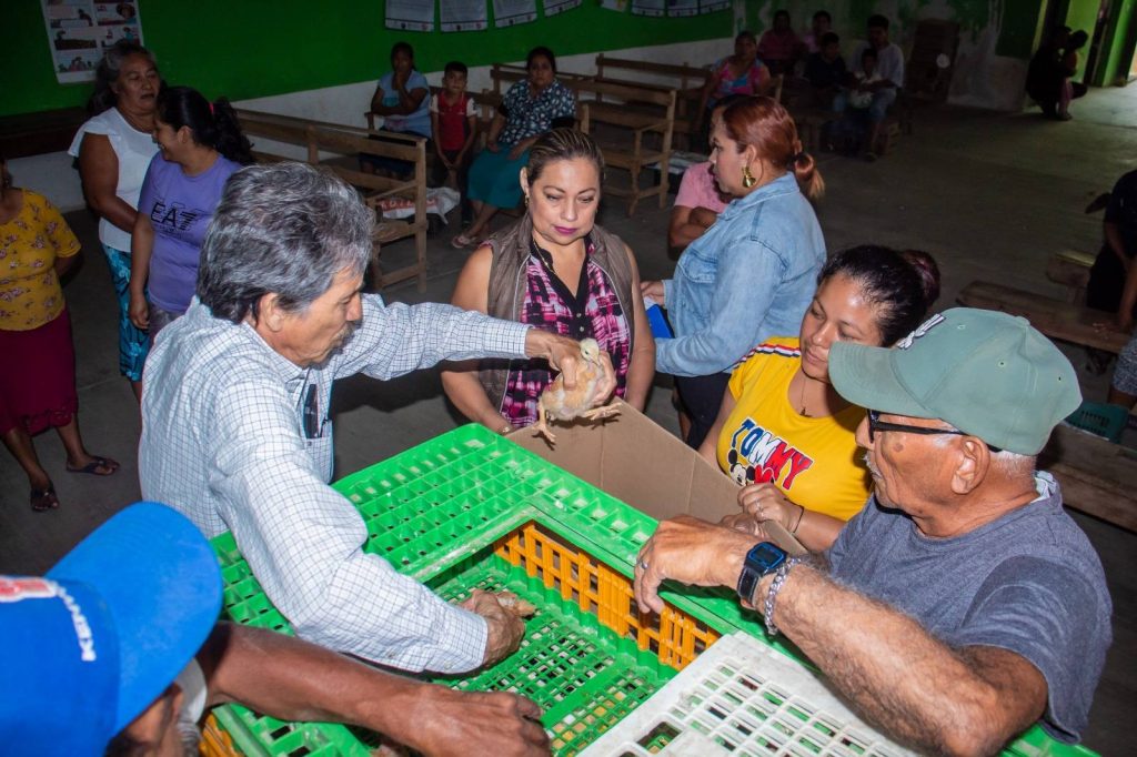 En representación de la Presidenta Municipal Eva Elia Guzmán Gutiérrez, la Regidora Eva María Morales Leyva, hizo entrega de 50 paquetes de pollitas doble propósito a familias de dicha comunidad con la finalidad de contribuir a la producción de alimentos sanos para el autoconsumo y la venta de excedentes qué permitan mejorar las condiciones de vida familiar.