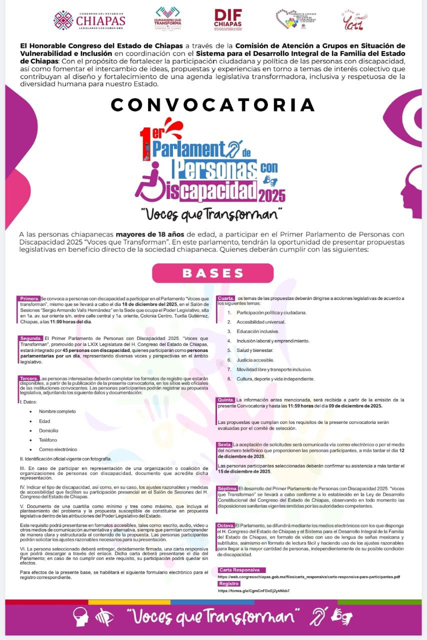El DIF Cintalapa hace extensiva la invitación a participar en la convocatoria del 1er. Parlamento de Personas con Discapacidad 2025, “Voces que Transforman” por el Gobierno del Estado por medio del DIF Chiapas, Sistema DIF Chiapas, el H. Congreso del Estado y la Líder Juvenil en el Estado de Chiapas realizarán; bases del concurso se describen a continuación:
