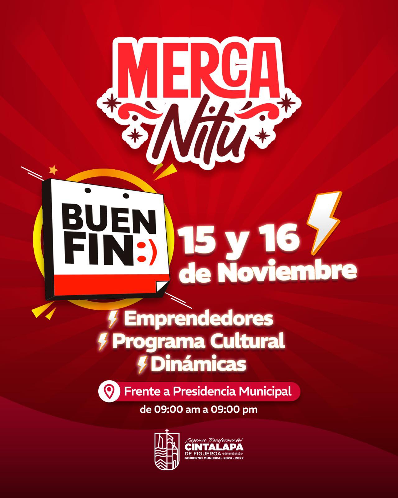 El Gobierno de Cintalapa de Fig., Chiapas, te invita a que asistas a nuestro #MercaNitu “Buen Fin 2025”; este 15 y 16 de Noviembre a partir de las 09:00 de la mañana en el Parque Central de Cintalapa.